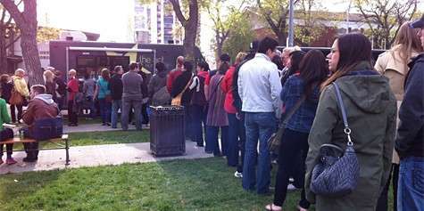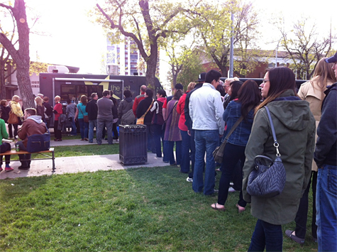 Patrons lining up at the new Loggy Dog food truck along Stephen Avenue.