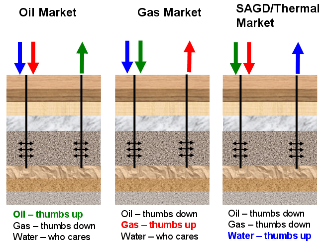 In the FaCOF process, produced crude oil is used to flood gas reservoirs to increase gas production at times when prevailing market conditions warrant selling natural gas over producing and selling crude. But if market conditions change such that economics on oil projects outperform those of gas projects, then the reservoir is switched back to gas flood to help bring pressures up to produce the injected oil. In a very similar scheme, Mr. Ruckdoogle proposes injecting oil and natural gas into old or watered out conventional reservoirs to produce water for SAGD/Thermal operations and to use as frack water for unconventional reservoirs when the market demand for these type of projects are superior.