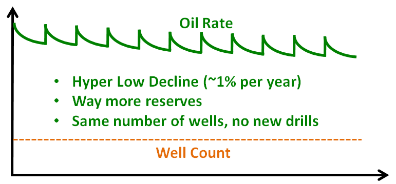 Anyhow, here’s how it works: When a new well is drilled, we will let it produce until its rate drops to 90% of its initial (flush) rate, at which time we shut it in to let things pressure up – then we turn it on again, and voila, more flush production. Rinse and repeat. – Nancy Rickles, Chief Production Engineer, Quagmire Energy