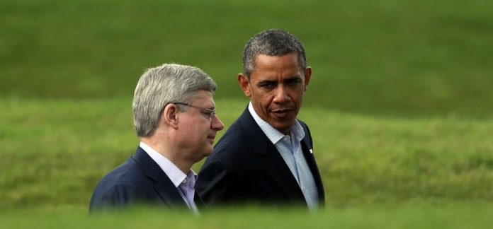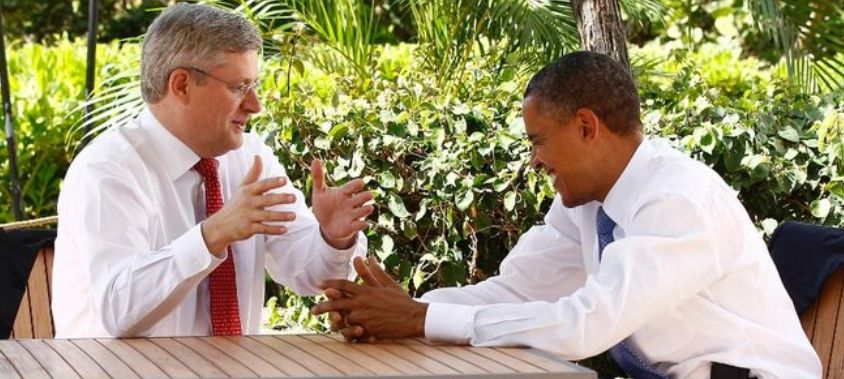 “And your First Lady said it was *this* big, eh! No doubt aboot it! Don’t cha know?” – Harper and Obama hamming it up before a round of golf