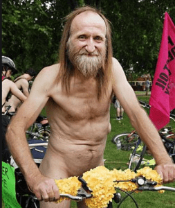 Randy Hoiklinker, riding his bike to a nudist bake sale