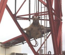 A screen grab from surveillance footage showing a brown bear chillin’ on the derrick
