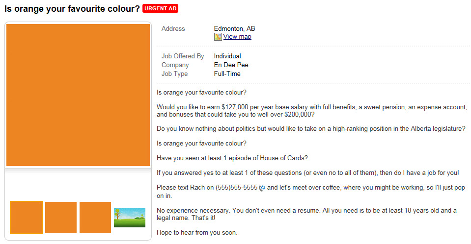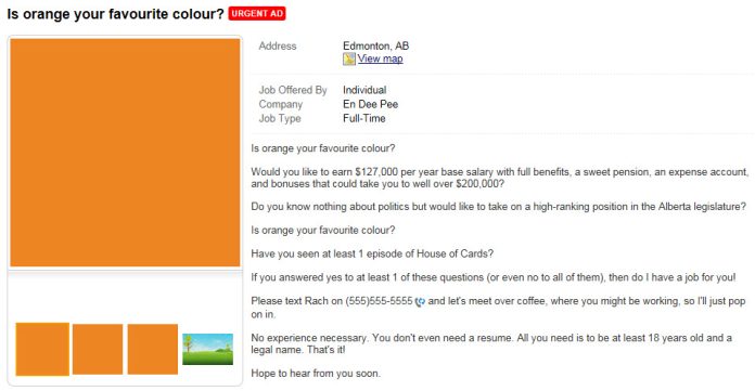For all of you Albertans who have ever wondered how some of the NDP MLAs were recruited for the recent Alberta election – where the NDP propelled itself to a 53-seat majority – wonder no more. 2P News has uncovered a Kijiji ad that was allegedly used to recruit new staffers.
