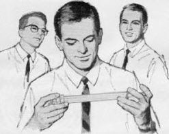 A young engineer trying out a slide rule, with curious onlookers in the background.