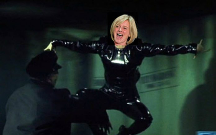 Agent Rhytid Maximus (played by Rachel Notley) during an action scene where she kicks an officer played by former Toronto Mayor Rob Ford square in the grill.