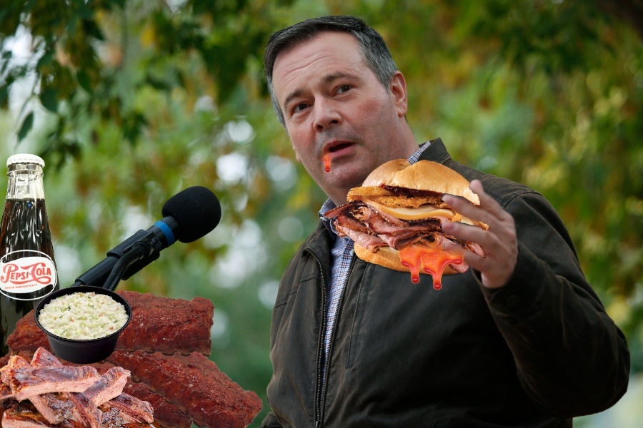 Premier Jason “Smokehouse” Kenney talking to reporters outside of a Sherwood Park BBQ shack about the proposed project