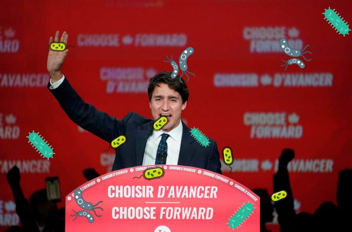 Justin "Coiffeo" Trudeau, after winning election, surrounded by the bacteria that propped him for the win