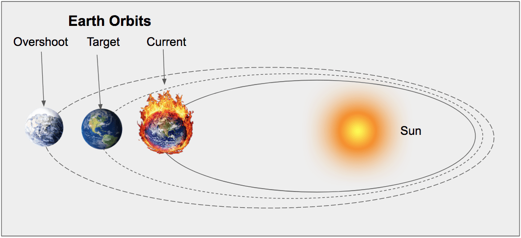 From Figure 1, we can see that the Earth’s current orbit puts it in serious trouble. The target orbit will bring the Earth’s average temperature down by 2.7 degrees Celsius which will effectively reverse all impacts of climate change to date. But if too much mass is transferred to the Kuiper belt, then AT’s computer models predict the Earth will freeze, which in effect will also put an end to climate change but in a different way.